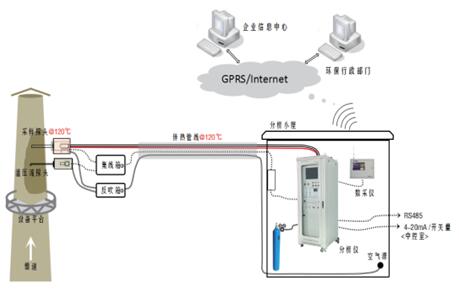 采樣探頭安裝于企業(yè)廢氣排口,排口被測(cè)廢氣被負(fù)壓抽泵抽取進(jìn)入采樣探頭探桿(不加熱),經(jīng)過陶瓷濾芯進(jìn)入伴熱管線(伴熱溫度可設(shè)置),樣氣在伴熱管中繼續(xù)傳輸至預(yù)處理系統(tǒng),在預(yù)處理系統(tǒng)經(jīng)過二級(jí)過濾和分流后按照一定流量送至在線氣相色譜儀(GC-FID)。在線氣相色譜儀控制內(nèi)置自動(dòng)取樣平面十通閥和定量環(huán)系統(tǒng)取1mL的被測(cè)樣氣,借助載氣送入色譜柱分離和FID做定性、定量分析。分析結(jié)果通過工控機(jī)保存,并和排氣筒監(jiān)測(cè)排放參數(shù)一起通過數(shù)采儀送至環(huán)保監(jiān)控平臺(tái)。