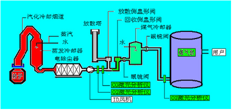 如圖2可見(jiàn),在回收側(cè)盅形閥/分散側(cè)盅形閥前布設(shè)煙氣在線(xiàn)分析儀,只有當(dāng)通過(guò)CO在線(xiàn)監(jiān)測(cè)系統(tǒng)測(cè)得轉(zhuǎn)爐煤氣中的CO濃度在30%以上時(shí),才打開(kāi)氣體切換站的回收側(cè)盅形閥進(jìn)入煤氣柜儲(chǔ)存,否則通過(guò)分散側(cè)盅形閥通過(guò)放散塔點(diǎn)火燃燒。在煤氣柜前布設(shè)煙氣在線(xiàn)分析儀,只有在線(xiàn)監(jiān)測(cè)系統(tǒng)測(cè)分析保證煤氣柜內(nèi)O2含量不會(huì)超標(biāo)(控制在1%以下)才允許焦煤煤氣進(jìn)入煤氣柜,否則啟動(dòng)停止回收,以保證系統(tǒng)的穩(wěn)定性和安全性。