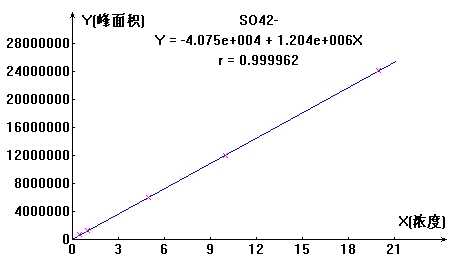 按照硫酸根各濃度點依次進樣,計算其峰面積,以濃度和峰面積繪制標準曲線,線性相關(guān)系數(shù)為0.99996,結(jié)果詳見圖1。