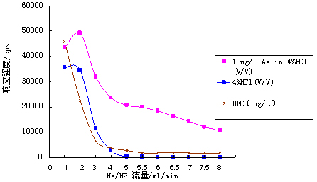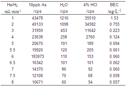 儀器首先在標準模式下進行參數(shù)優(yōu)化(利用10μg·L-1的Li、Co、In、U、Ce調(diào)諧液對儀器工作參數(shù)進行調(diào)節(jié),使儀器靈敏度高,同時氧化物及雙電荷產(chǎn)率小于3%);再開啟He/H2碰撞反應氣,逐步增大He/H2流量,測試超純水、4%HCl及10μg·L-1 As(4%HCl介質(zhì))在75amu處的響應信號,計算其背景等效濃度(詳細數(shù)據(jù)見表1及圖1);并利用As標液進一步優(yōu)化He/H2流量,得到儀器工作參數(shù)如表2所示。
