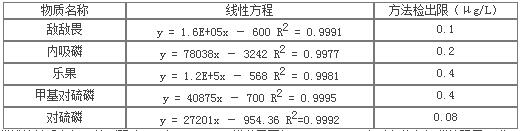 結(jié)果表明6種有機(jī)磷線性關(guān)系良好,檢測限為0.08~0.4μg/L,能滿足國標(biāo)GB 3838-2002中對六種有機(jī)磷的限量要求。