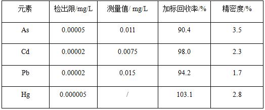 在碰撞反應(yīng)模式下,以?xún)?nèi)標(biāo)法校正儀器信號(hào)漂移,將配制好的各元素標(biāo)準(zhǔn)溶液上機(jī)測(cè)試,繪制標(biāo)準(zhǔn)曲線(xiàn),各元素標(biāo)準(zhǔn)工作曲線(xiàn)線(xiàn)性相關(guān)系數(shù)R>0.999;對(duì)樣品空白溶液平行測(cè)定11次,計(jì)算11次樣品空白值的標(biāo)準(zhǔn)偏差,并以三倍標(biāo)準(zhǔn)偏差/工作曲線(xiàn)斜率表示檢出限;間隔2min,對(duì)樣品平行測(cè)定7次,計(jì)算7次測(cè)試結(jié)果對(duì)應(yīng)的相對(duì)標(biāo)準(zhǔn)偏差,表示精密度;對(duì)樣品進(jìn)行加標(biāo)實(shí)驗(yàn),并計(jì)算加標(biāo)回收率。各元素檢出限為0.000005~0.00005mg/L,加標(biāo)回收率為90.4%~103.1%,精密度為1.7%~3.5%。