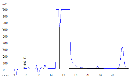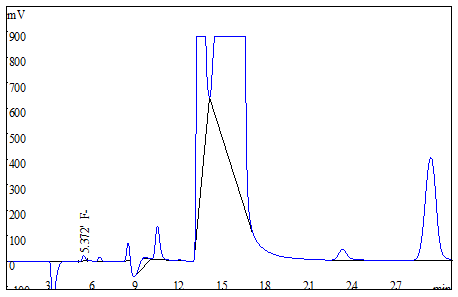 將大米、茶葉試樣分別粉粹后過篩,各稱取0.25g(精確至0.0001g),于氧彈燃燒儀進行燃燒,冷卻后定容,經(jīng)0.22μm的水系濾膜過濾后上機得到樣品譜圖,如下圖3、圖4所示;食用油樣品直接稱重后進行氧彈燃燒,測試得到的譜圖如圖5所示;生活飲用水直接上機后得到樣品譜圖詳見圖6。其中大米、茶葉、食用油中氟離子的測定結(jié)果均低于方法檢出限,同時對4種試樣進行了加標(biāo)處理,加標(biāo)回收率在95.6%~102.3%之間。測試數(shù)據(jù)詳見表2。
